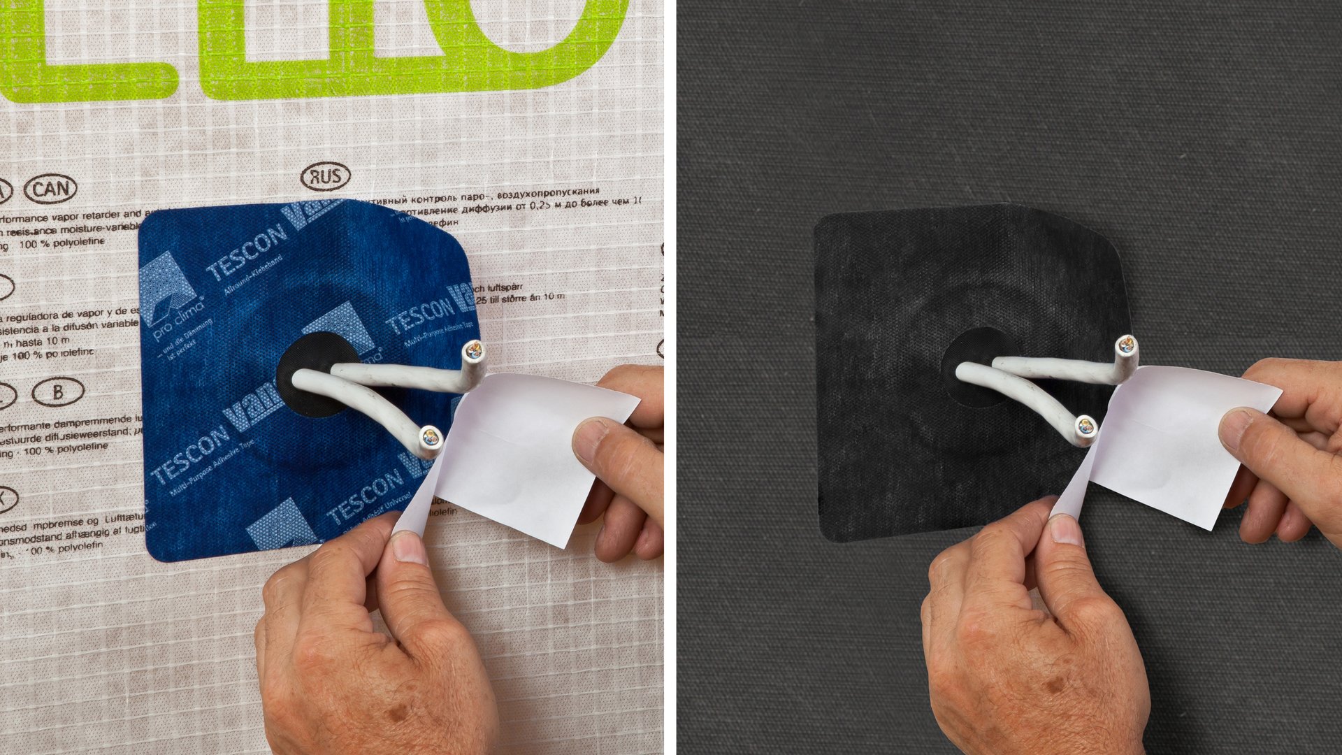 Kabel door het voorgestanste gat in de EPDM trekken, manchet op de af te dichten ondergrond plaatsen en uitlijnen. Geschikt voor kabels met een diameter van 4,8-12 mm.